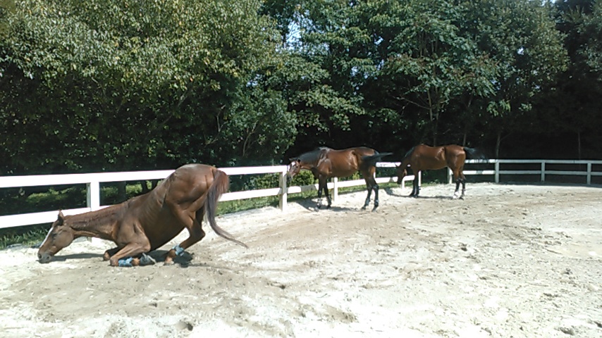 馬場に放すと1番にレコルトが砂浴び、その後アンドレアがぐるぐると同じところを回りながらゆっくり砂浴び